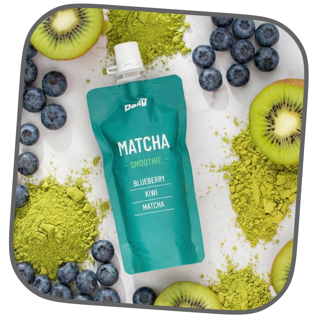 The Daily+ Matcha Smoothie is a 50g functional smoothie that blends the richness of matcha, blueberries and kiwi into a delicious ready on-the-go snack. Crafted with a base of selected fruit and juice extracts, without the need for refrigeration.